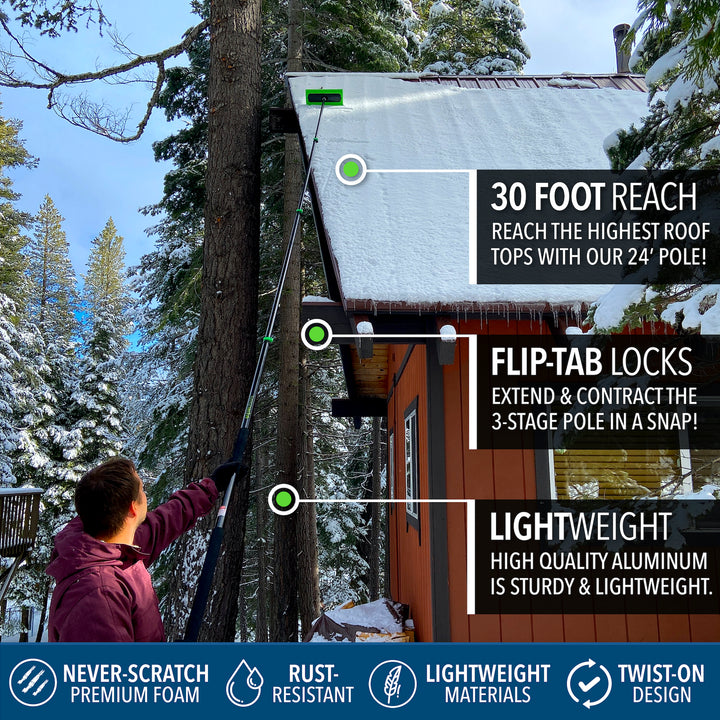 - PRE-ASSEMBLED FOR IMMEDIATE USE, REACH UP TO 30 FT WHEN STANDING, EASY STORAGE – Save yourself from the headaches of missing parts, impossible directions, and broken pieces. The SnowBuster is the ONLY Snow Rake that’s Pre-Assembled. Simply twist the SnowBuster onto the Pole and you’re ready to go. It extends up to 24 feet long when standing reaches up to 30 feet high. Untwist the SnowBuster from the pole for convenient storage. (Note: Best on steeper-pitched roofs, but suitable for all roofs)